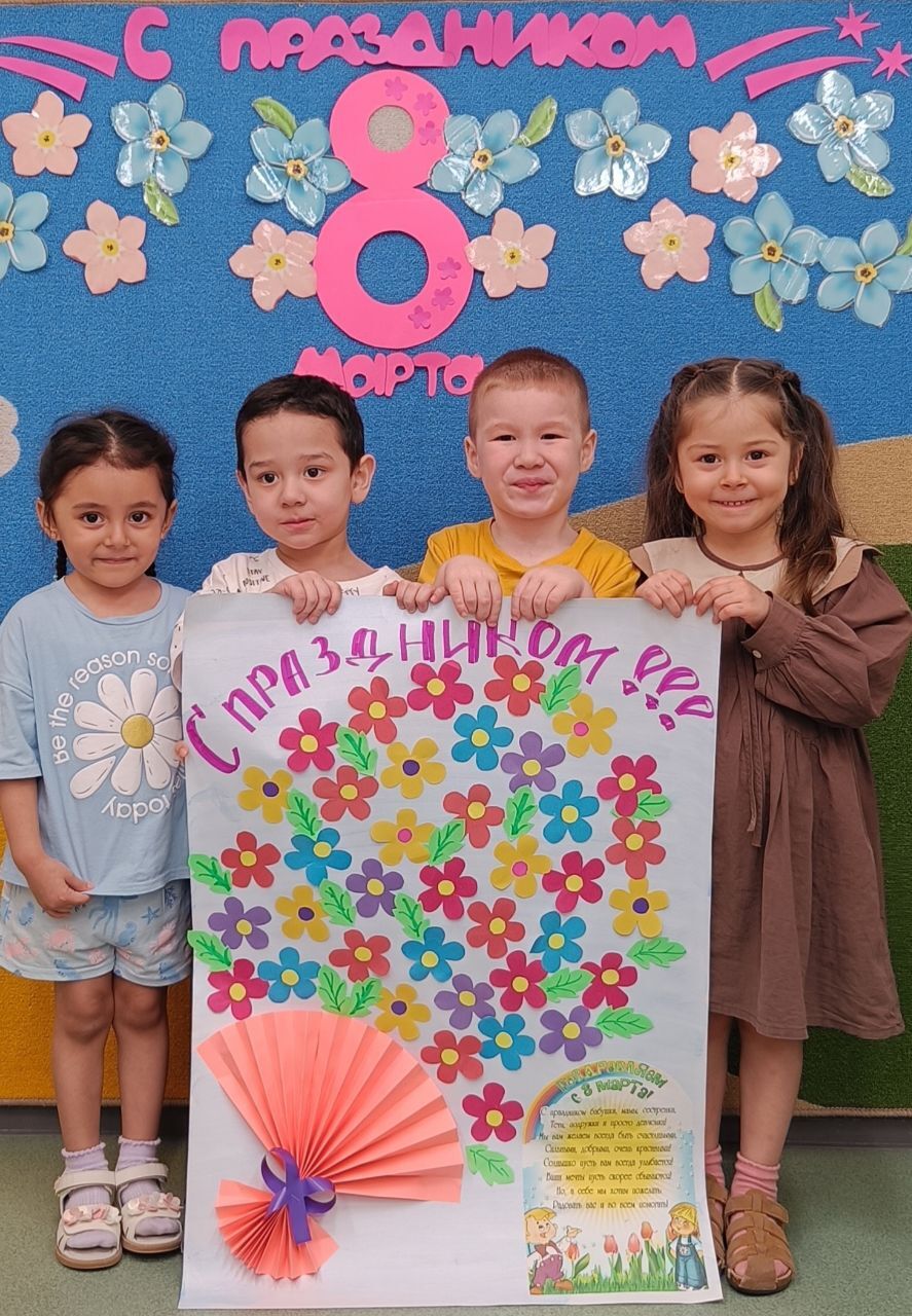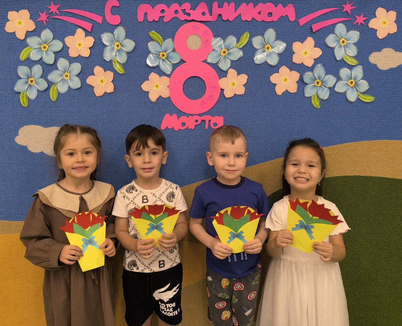 Ребята вместе с воспитателями создавали своими руками подарки для мам: из цветной бумаги сделали аппликацию «Тюльпаны в вазе» и красками нарисовали «Букет тюльпанов», которые подарили своим мамам в честь праздника. Также вместе с воспитателями сделали поздравительный плакат, где было много разных хороших пожеланий бабушкам, мамам.