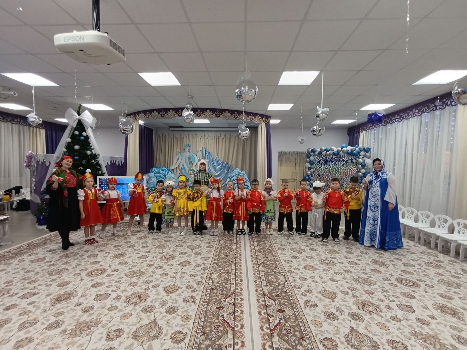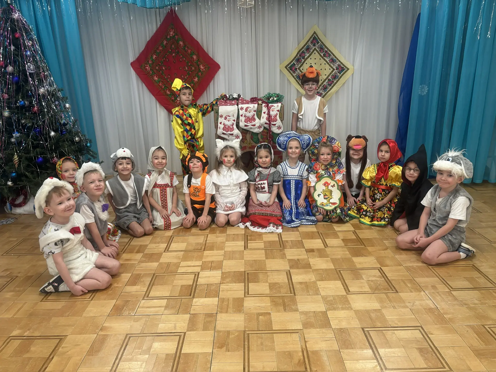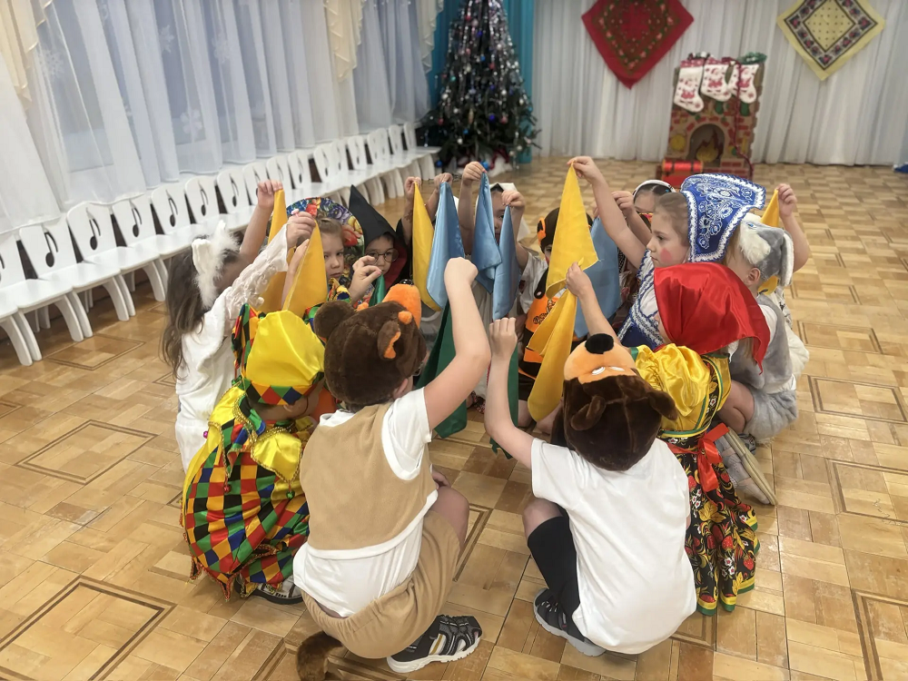 После весёлого обхода все собрались в украшенном зале на главный праздник «Колядки»! Здесь звучали не только традиционные народные песни, но и современные зимние композиции. Ребята с воодушевлением водили хороводы вокруг ёлки, играли в народные игры, такие как «Золотые ворота», отгадывали загадки о зиме и Рождестве. Кульминацией праздника стал задорный танец с бубенцами и шумовыми инструментами, который прославлял наступающие святки.