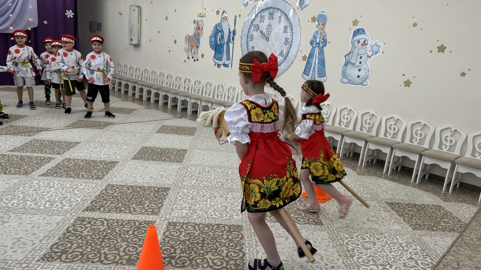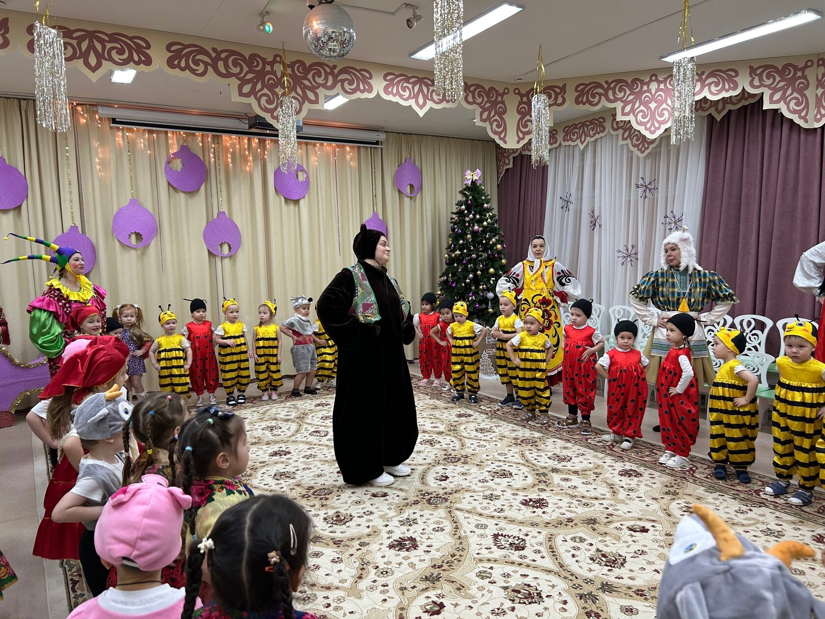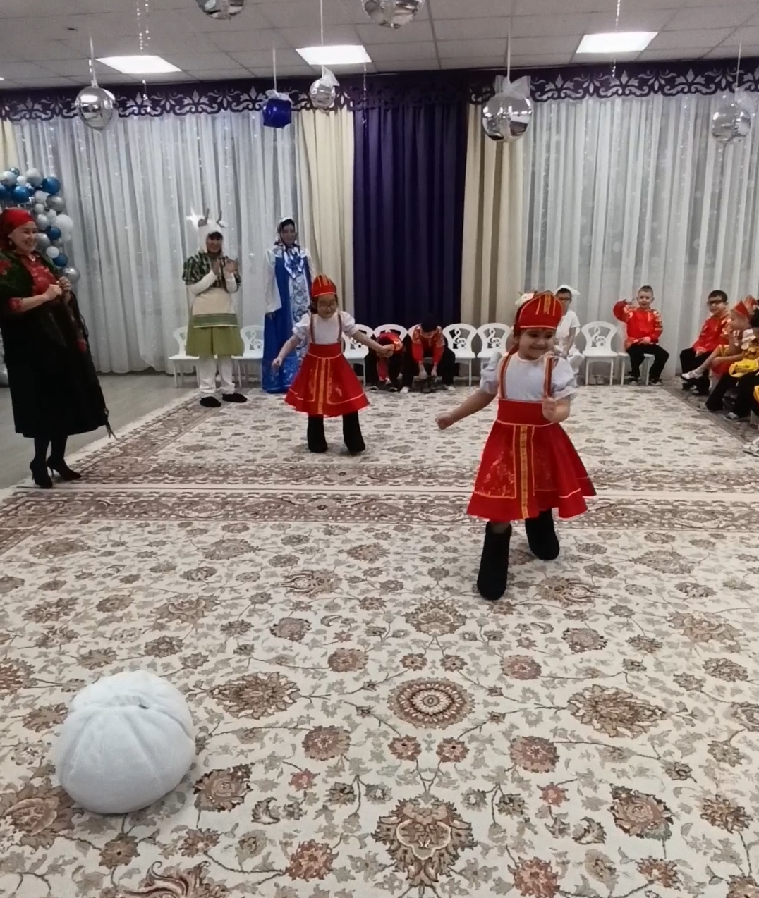 После весёлого обхода все собрались в украшенном зале на главный праздник «Колядки»! Здесь звучали не только традиционные народные песни, но и современные зимние композиции. Ребята с воодушевлением водили хороводы вокруг ёлки, играли в народные игры, такие как «Золотые ворота», отгадывали загадки о зиме и Рождестве. Кульминацией праздника стал задорный танец с бубенцами и шумовыми инструментами, который прославлял наступающие святки.