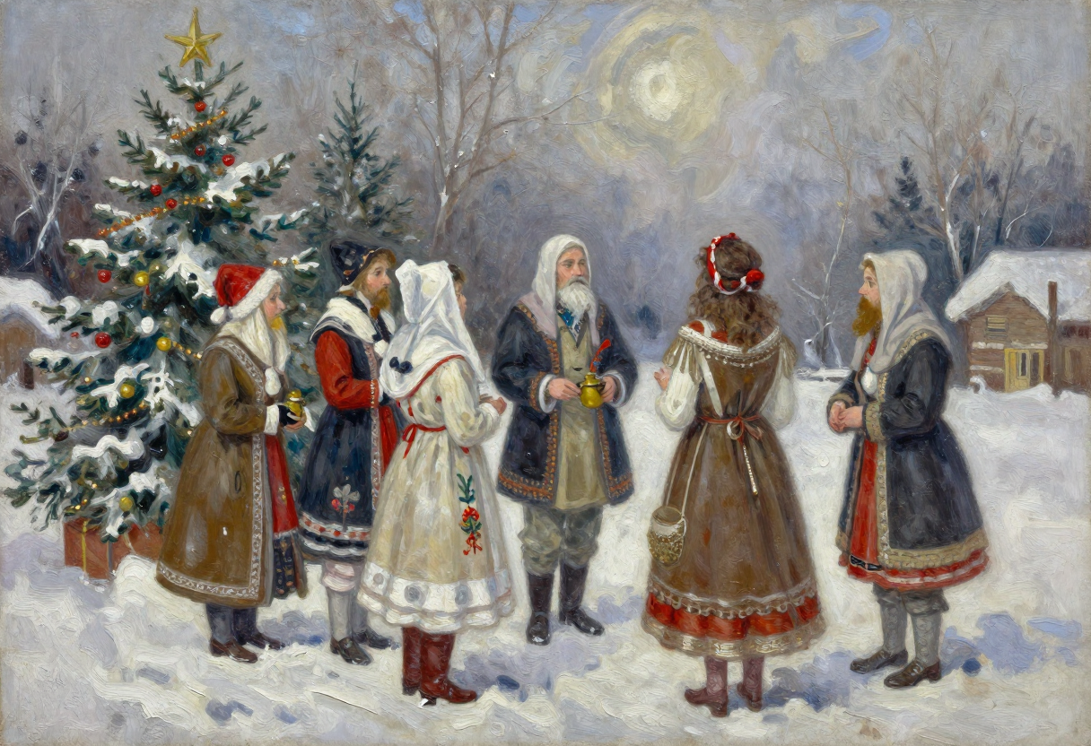 В Святочные вечера устраивались на Руси праздничные гуляния: по дворам ходили ряженые и желали здоровья, богатого урожая. Все с нетерпением ожидали прихода ряженых с их колядками. Люди верили, что к кому они зайдут — тот двор в новом году удачлив будет, с достатком и прибылью.