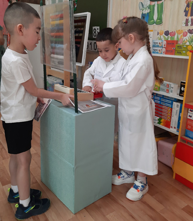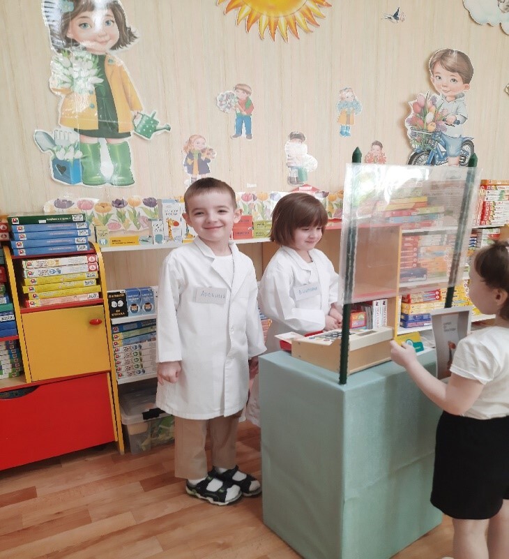 Екатерина Александровна рассказала детям о работе аптеки, о том, какие лекарства существуют, как они помогают людям, и о важности правильного приема медикаментов. Она показала детям алгоритм работы с рецептом: кто выписывает рецепт, как лекарства отпускаются в аптеке по рецепту, о важности соблюдения правил выдачи лекарств по рецепту. После познавательной беседы воспитатель вместе с мамой-фармацевтом предложили детям поиграть в сюжетно-ролевую игру «Аптека». Ребята с большим интересом приняли предложение и с удовольствием примеряли на себя роли аптекаря и покупателей.
