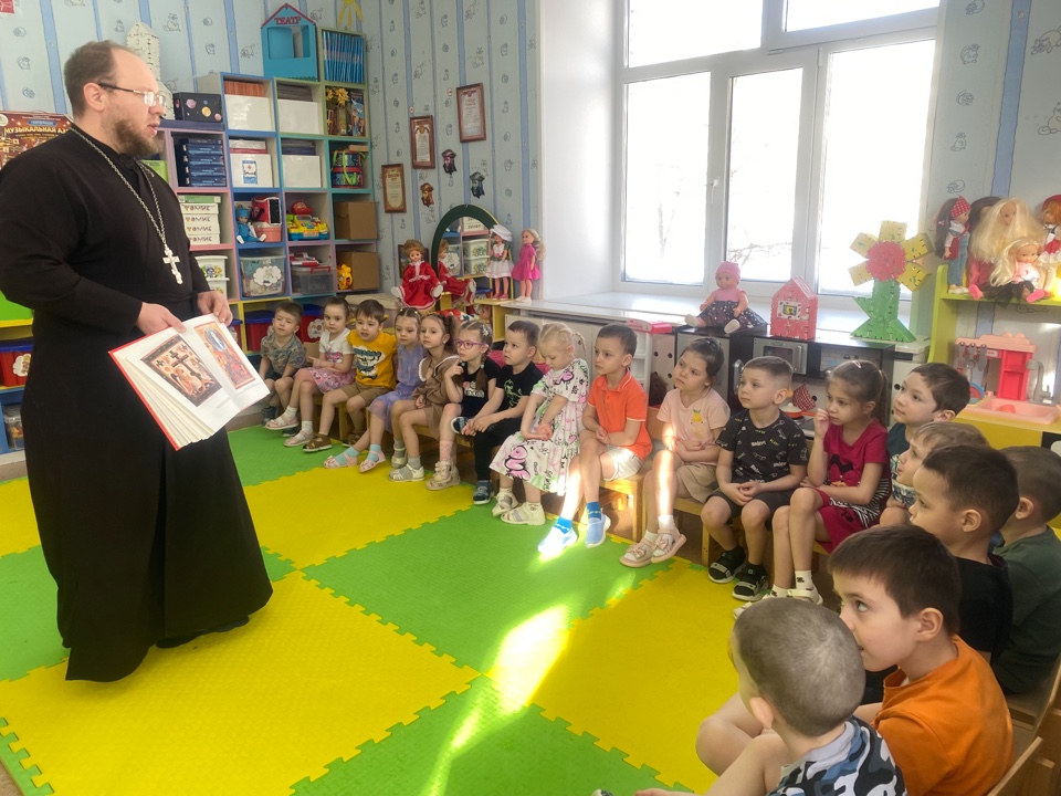 Эта встреча стала важным событием для малышей, ведь именно в такие моменты закладываются основы духовности и уважения к культурному наследию нашей страны. Отец Сергий провел с дошкольниками беседу о доброте, добрых поступках и важной роли книги в жизни каждого человека. Его рассказ был наполнен теплотой и добротой, благодаря чему маленькие слушатели буквально ловили каждое слово батюшки. Отец Сергий познакомил воспитанников с детской библией, иконами.