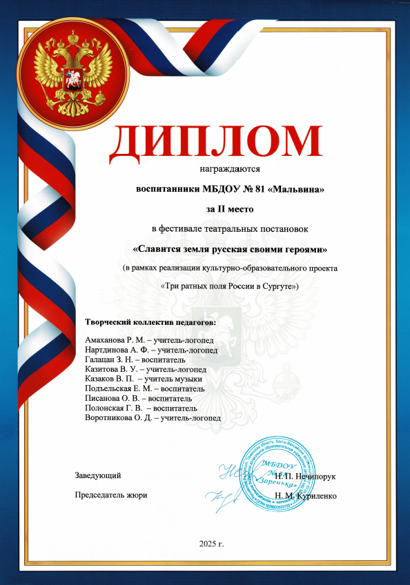 Наш детский сад № 81 «Мальвина» принял участие в городском фестивале театральных постановок «Славится земля русская своими героями» (в рамках реализации культурно — образовательного проекта «Три ратных поля России в Сургуте») и занял почетное второе место.