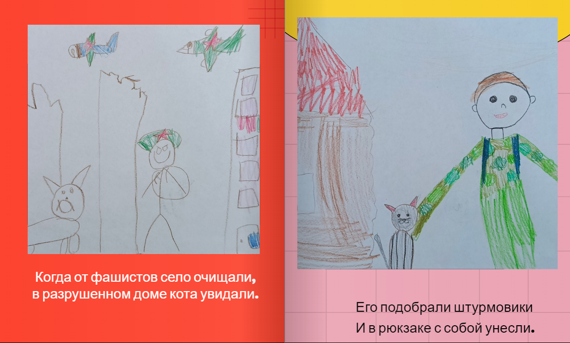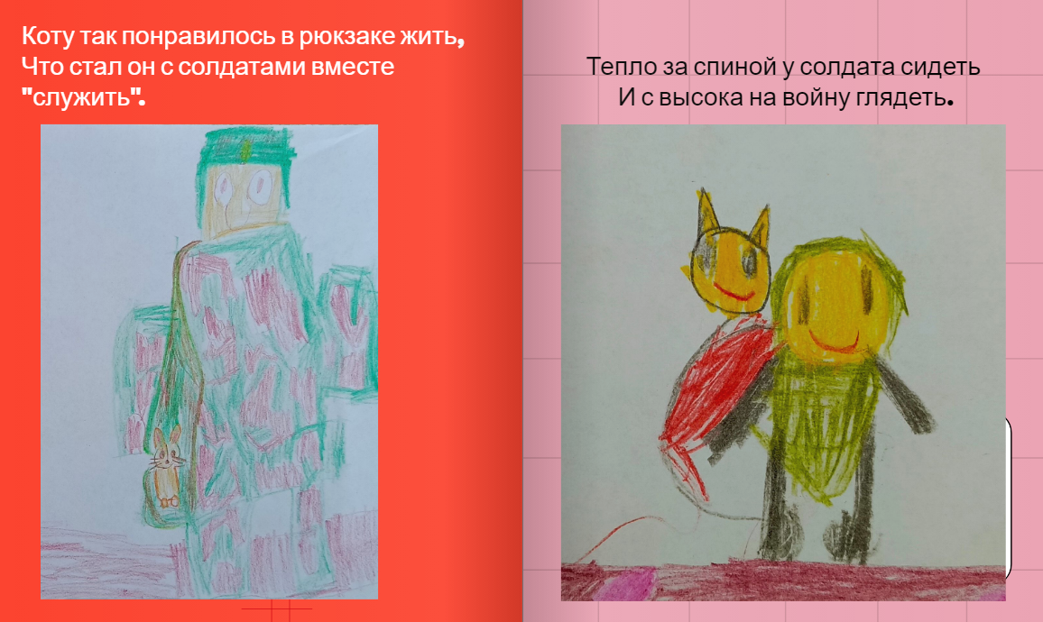 Дети узнают, в том числе, о «человечности» и милосердии русских солдат, которые нередко спасают беспризорных домашних животных и помогают им выжить. В ответ, домашние животные платят им той же монетой, доказывая на деле, что друзья познаются в беде. Из стихотворения «Кот по кличке Дикий» они узнали, что «ему снаряды нипочём, на танке ездит «лихачом!». Стихотворение «Кот и минное поле» раскрыло секрет про уникальное обоняние животного, которое помогло ему провести солдат через минное поле.