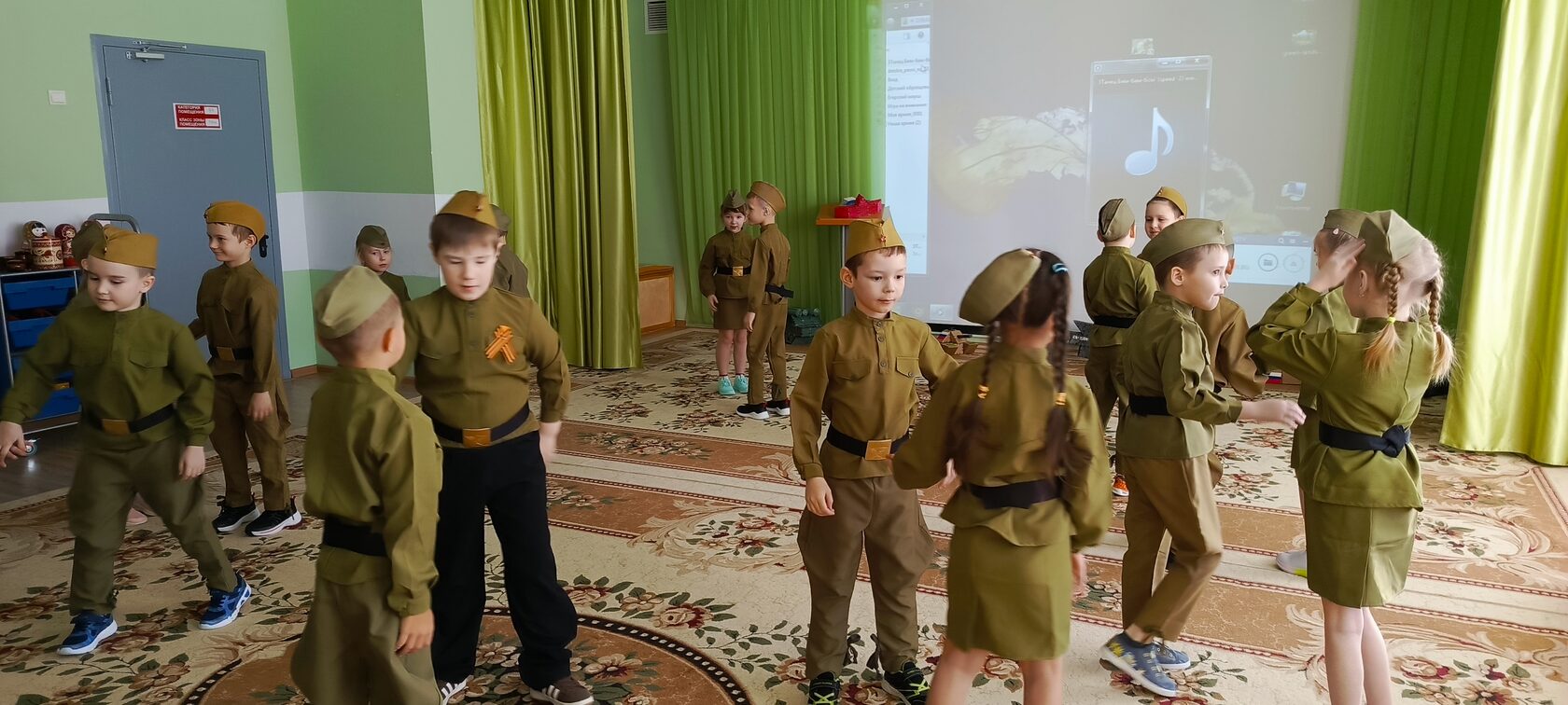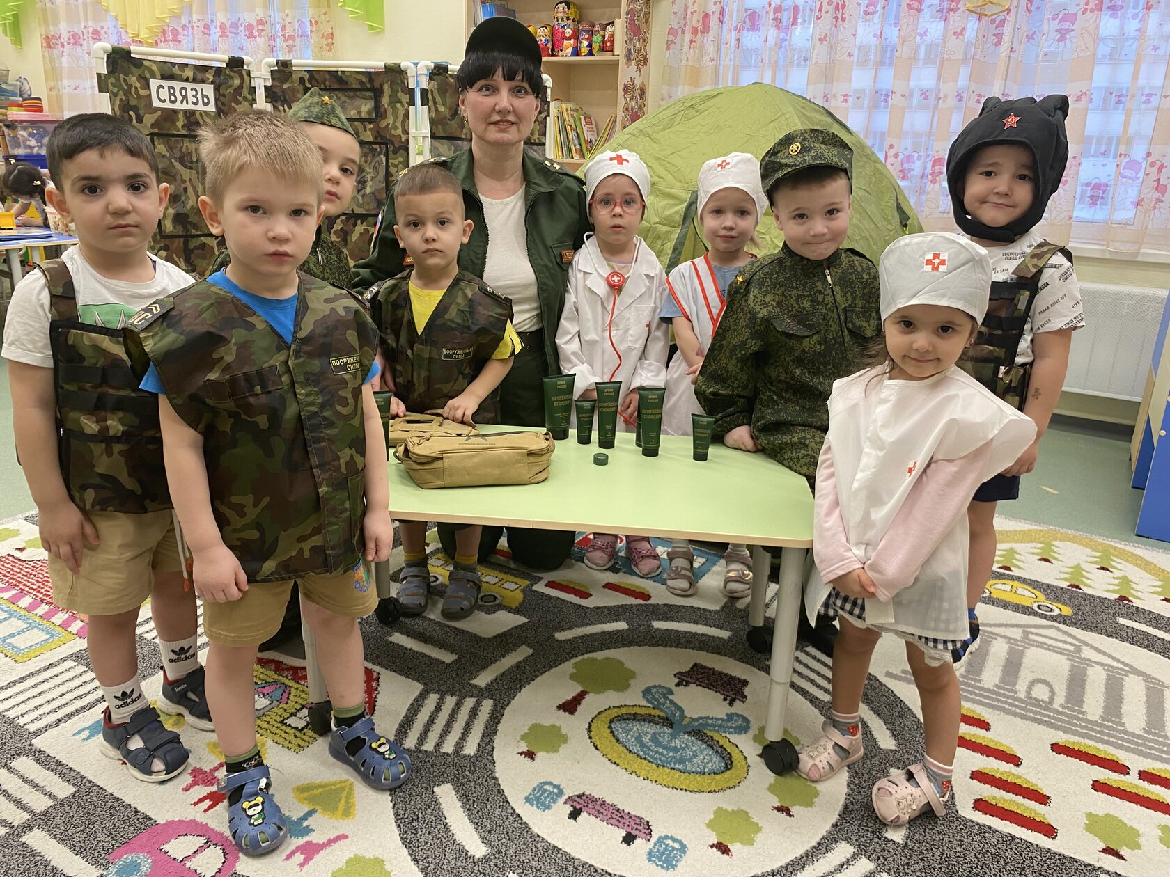 В течение недели в группе младшего дошкольного возраста «Белочка» детского сада «Сибирячок» звучали песни военных лет, педагоги знакомили детей с разными родами войск и военными профессиями, рассматривали иллюстрации, фото, картинки по данной тематике, играли в разные игры.