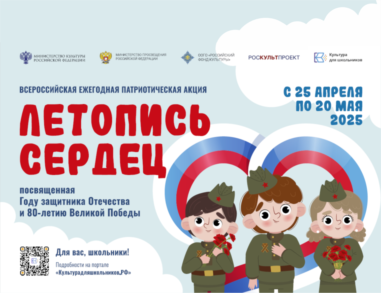 С 25 апреля по 20 мая 2025 года в рамках межведомственного культурно-образовательного проекта «Культура для школьников» пройдет Всероссийская ежегодная патриотическая акция «Летопись сердец», посвященная Году защитника Отечества и 80-летию Великой Победы.